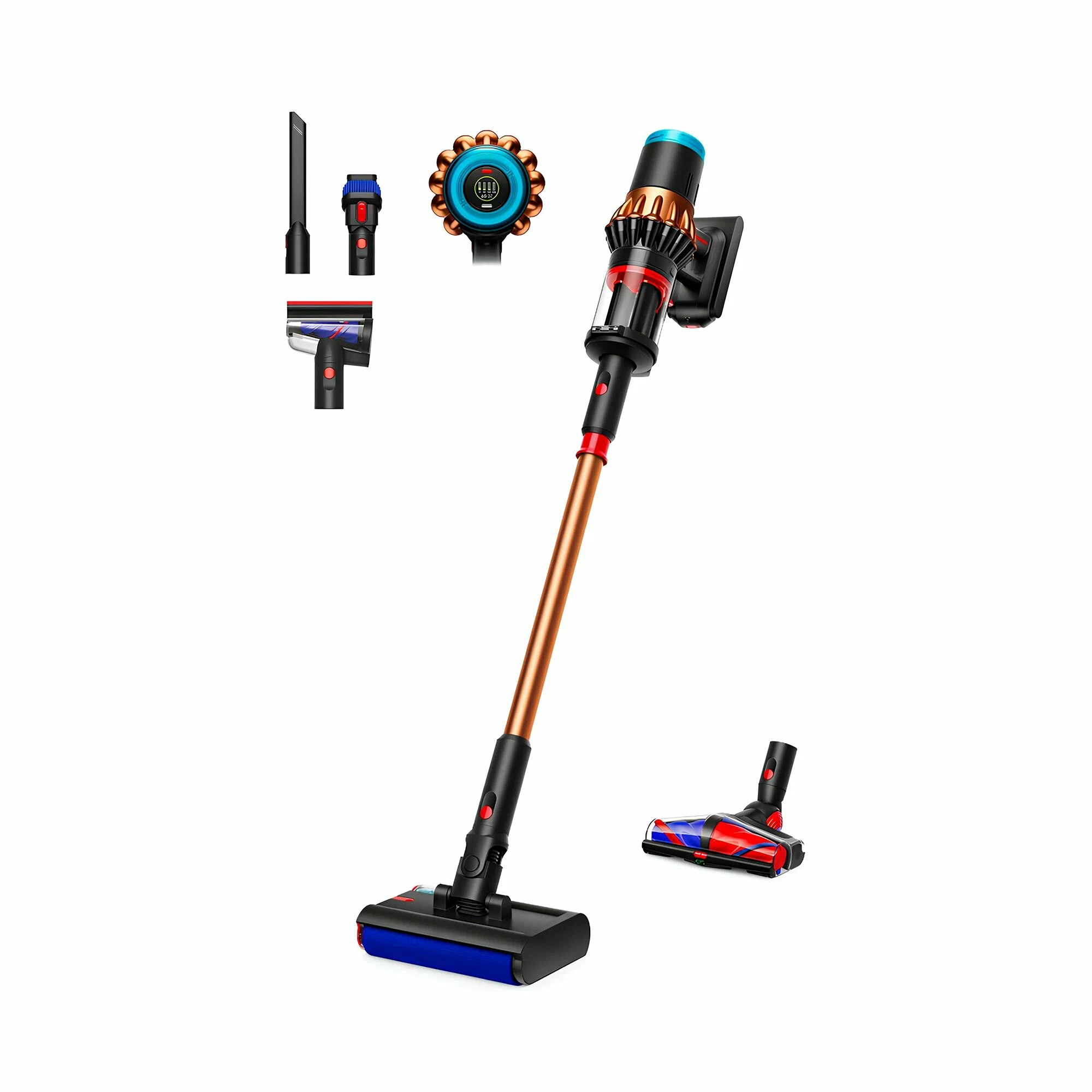 Вес пылесоса — 3,4 кг. В вертикальном положении с рукояткой — 1298 мм в длину. Цвет: чёрный / медный (Black/Copper).