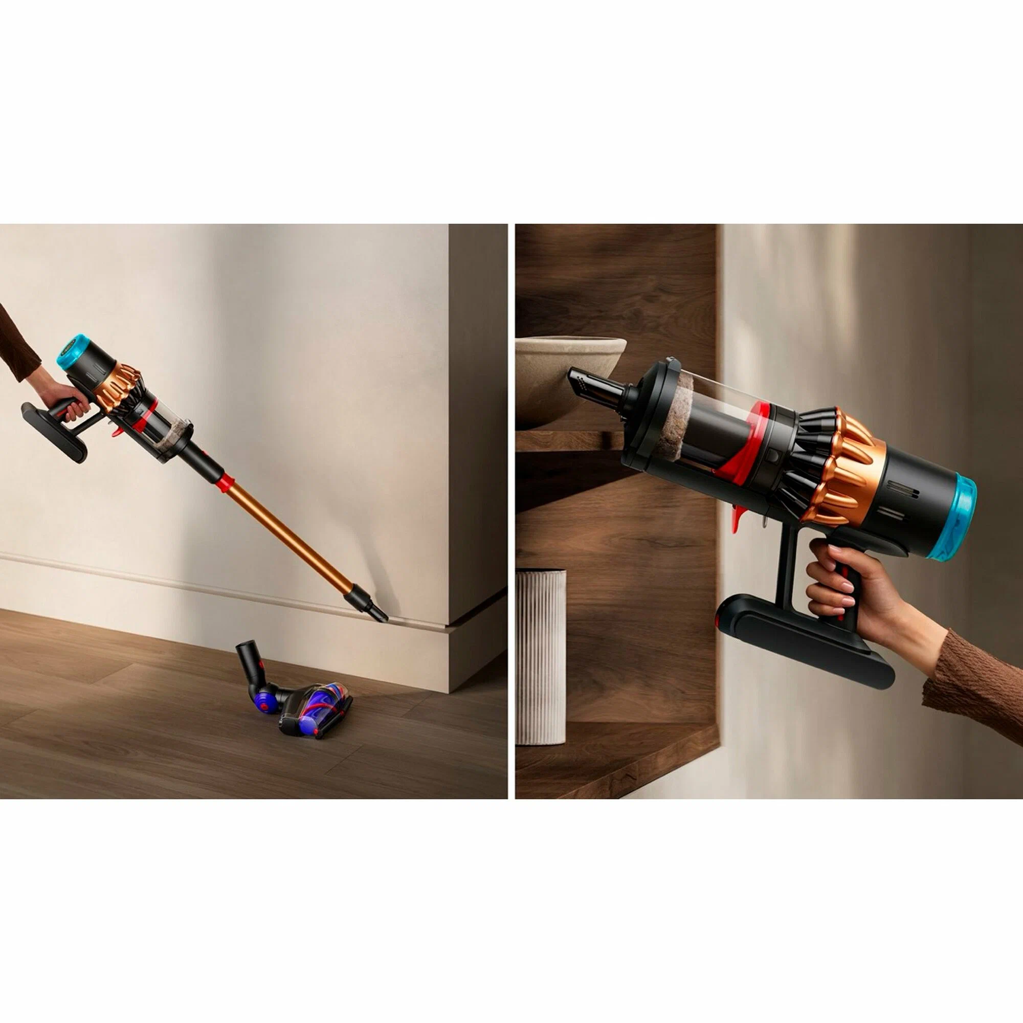 Главное нововведение V16 Piston Animal — насадка All Floor Cones Sense с двумя вращающимися коническими роликами. Конусообразная форма роликов — не просто дизайнерское решение. Когда длинный волос или шерсть зацепляется за конус, вращение закручивает нить к широкому основанию и отправляет её прямо в контейнер. Волосы длиной до 63 см не наматываются на вал — а именно это обычно превращает уборку в разборку насадки каждые 15 минут.