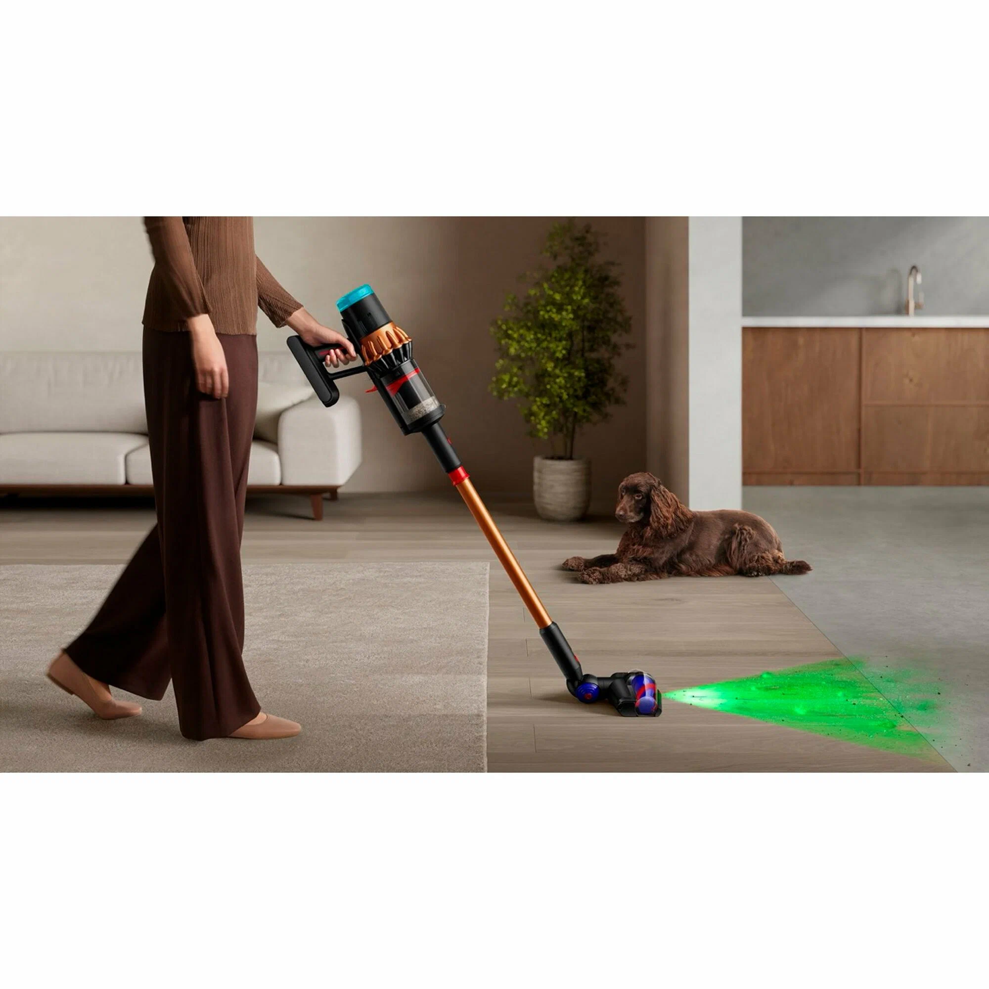 Центральная световая полоса на щётке подсвечивает поверхность: мелкая пыль, шерсть и аллергены, незаметные при обычном освещении, становятся видны как на ладони. Вы видите, что собираете — и видите, когда участок действительно чист.